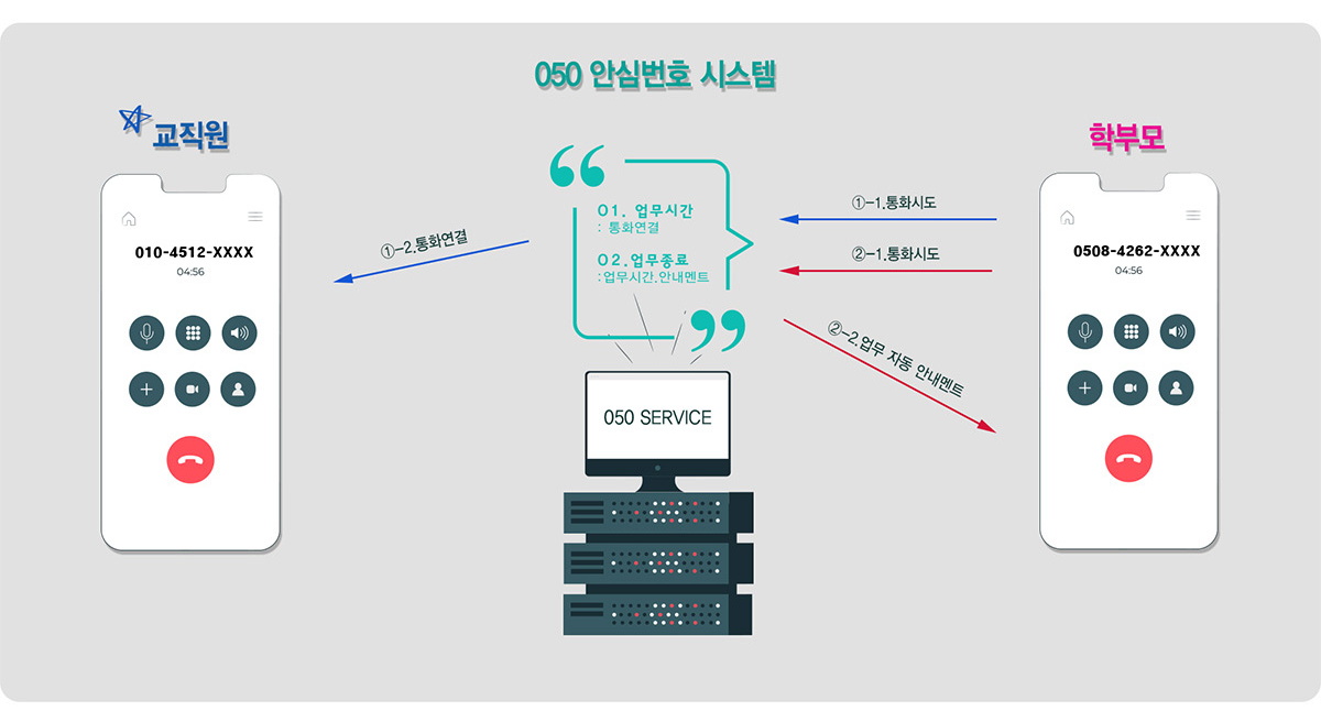 교직원 개인에게 050가상의 안심번호를 부여해서, 학부모(고객)과 개인전화번호 노출없이 수신통화를 가능하게 하는 서비스입니다.